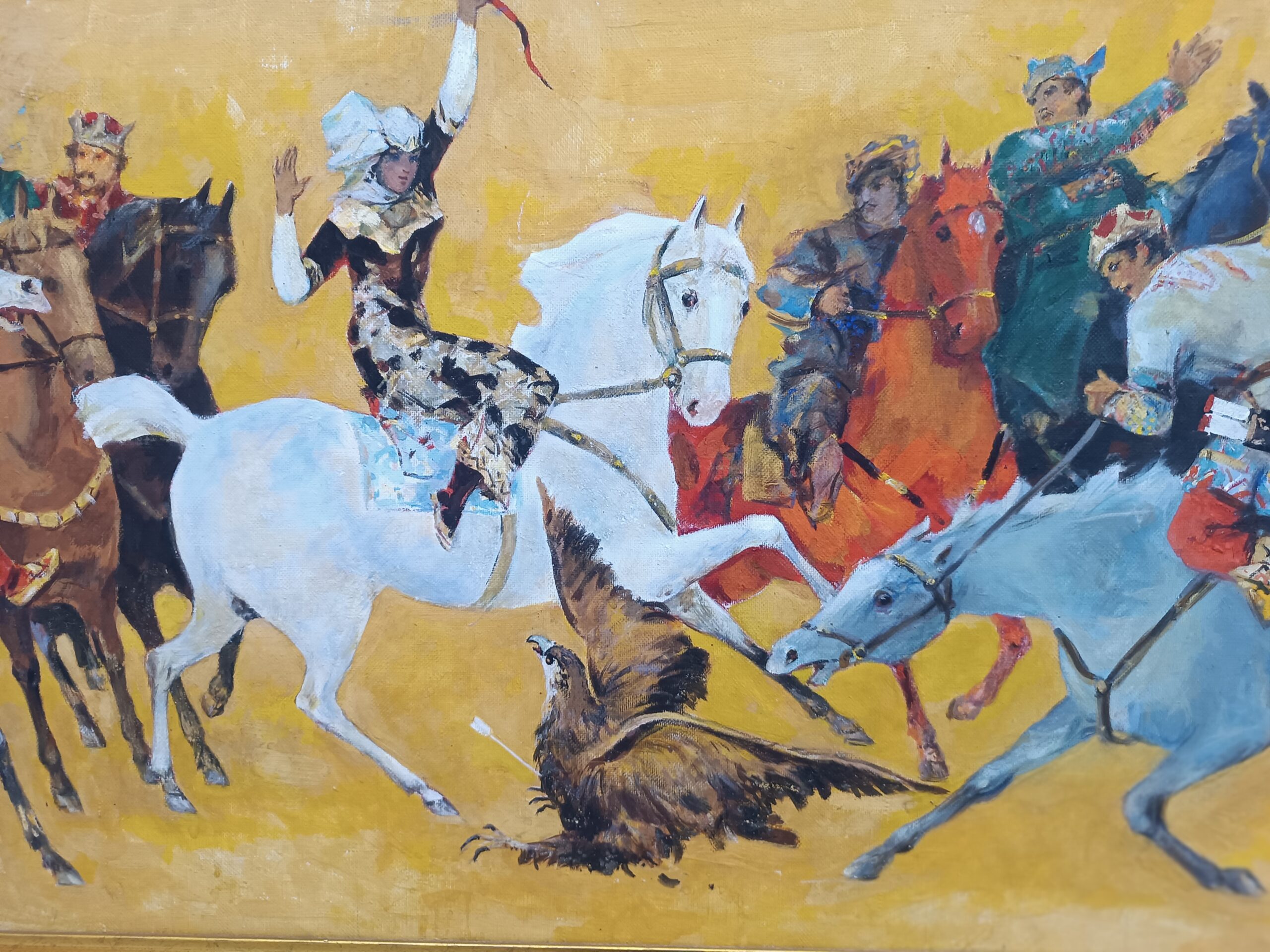 Legenda o Szocie Rustawelim niesie, że był zakochany w swojej królowej Tamarze, co ma mieć swoje odzwierciedlenie w jego narodowej epopei "Rycerz w tygrysiej skórze". Fragment obrazu olejnego "Polowanie Królowej Tamar" (Apolon Kutateladze), zbiory Gruzińskiego Muzeum Sztuk Pięknych. Fotografie: Aleksandra Zińczuk.