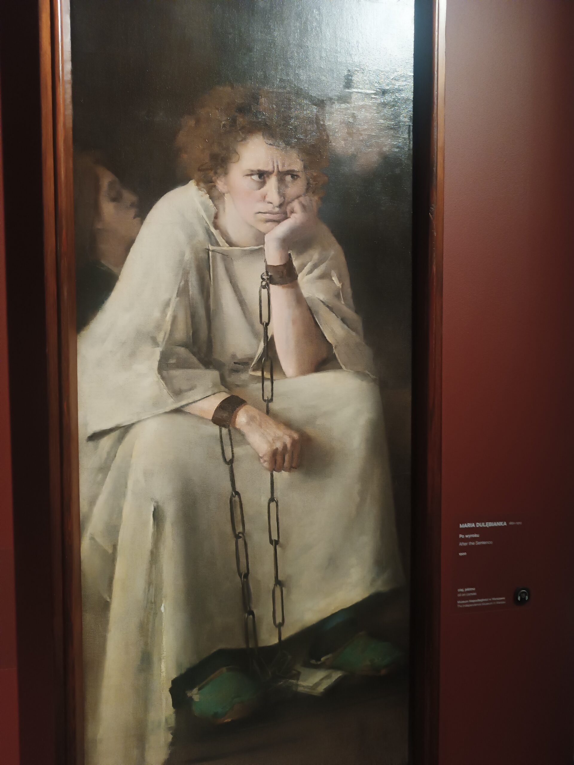 Wystawa przybliża nam malarstwo Marii Dulębianki, znanej bardziej jako wieloletnia towarzyszką życia autorki Roty czy emancypantka walcząca o prawa kobiet. Zwiedzających hipnotyzuje ogromny Portret. Sama jedna z myślą poety czy pełen czułości portretu Marii Konopnickiej w podeszłym wieku. Właśnie portrety i autoportrety oraz martwe natury, pejzaże czy też kameralne sceny religijne stanowią krąg tematyczny malarstwa kobiet w pierwszej części wystawy. Nie ma wielkich kompozycji historycznych czy mitologicznych najwyżej cenionych w ówczesnej hierarchii i najlepiej opłacanych. Wynika to nie tylko z zainteresowań malarek, lecz przede wszystkich z braków warsztatowych. Wielofiguralne obrazy wymagały profesjonalnego przygotowanie, a je zapewniały wyższe uczelnie, na które wtedy kobiet nie przyjmowano.