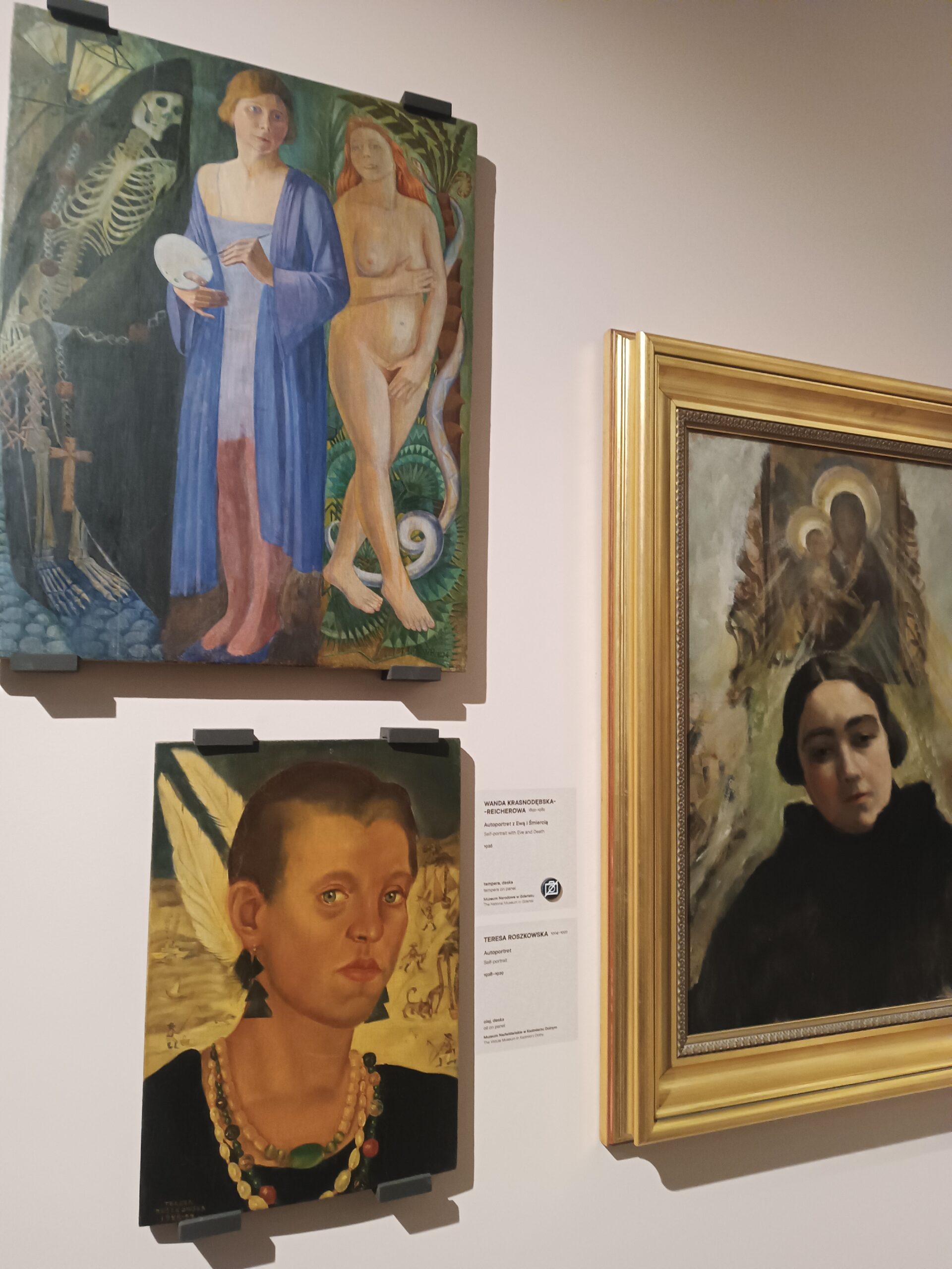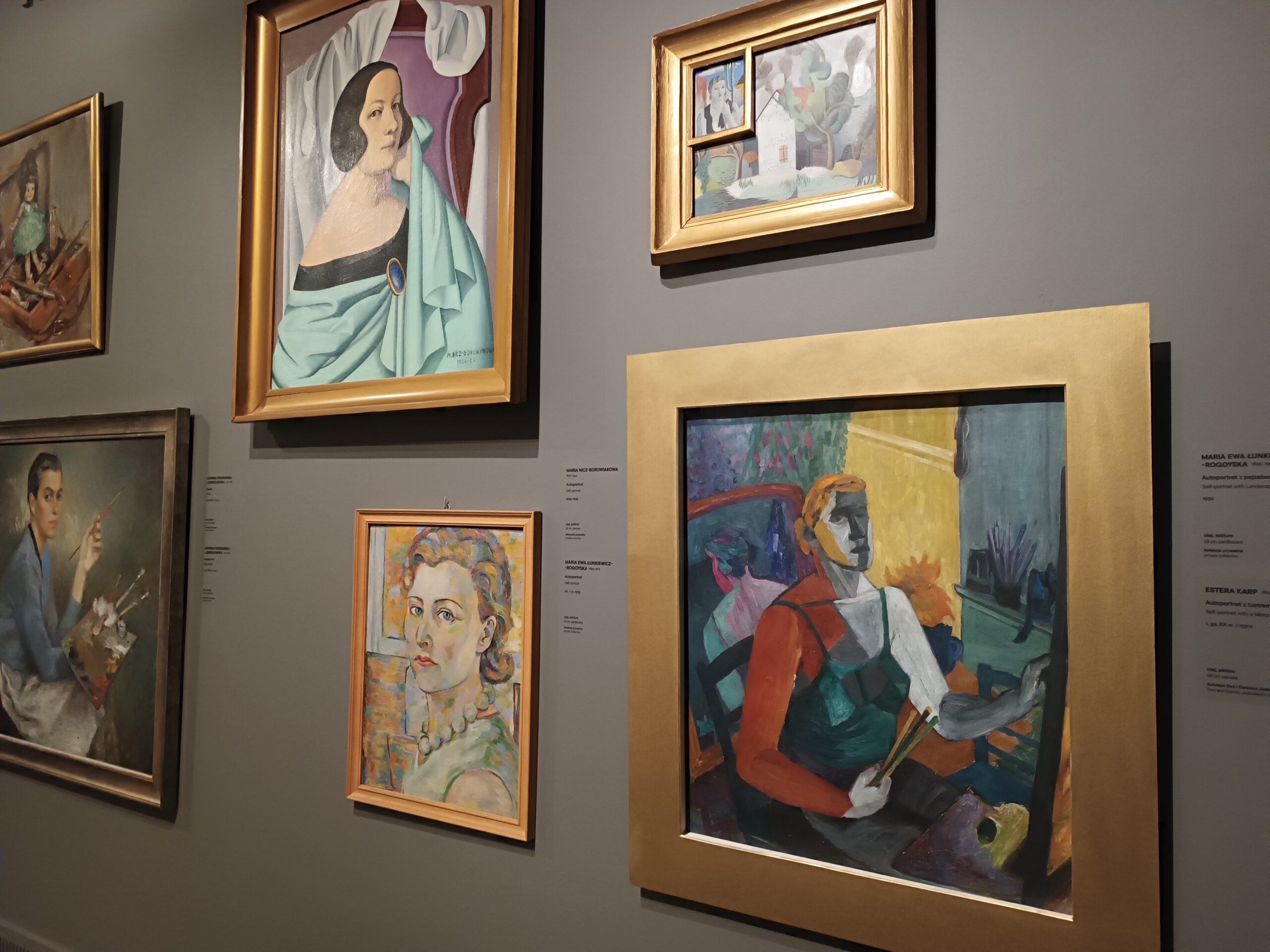 Autoportretów z atrybutami malarskimi jest na wystawie kilka, w ten sposób artystki podkreślały swój status. Ciekawie swą sytuację artystki przedstawiła Pia Górska na obrazie Przy lampie. Autoportret z 1898. Widzimy ją w typowym salonie, w czarnej sukni przy sztalugach, za nią przy stole, również w czarnej sukni, siedzi matka zajęta robótkami ręcznymi, prezentująca opresyjny system patriarchalny. Dużą niespodzianką są na wystawie obrazy Anieli Pająkówny, której losy zapewne potoczyłby się inaczej, gdyby nie toksyczny romans z psychodelicznym Stanisławem Przybyszewskim, którego przez lata finansowała. Umarła w biedzie i pochowano ją w zbiorowej mogile pod Paryżem. W tym pokoleniu malarek była jedyną mającą pochodzenie plebejskie, a staranne wykształcenie w kraju i za granicą uzyskała dzięki mecenatowi pracodawców jej ojca, Helenie i Mieczysławowi Pawlikowskim z Medyki. Warto przystanąć przy Autoportrecie córką, Stanisławą Przybyszewską (autorką dramatu Sprawa Dantona) To nie tylko świadectwo miłości, ale też odwagi, gdyż matki z nieślubnym dzieckiem spotykały się z ostracyzmem środowiska.