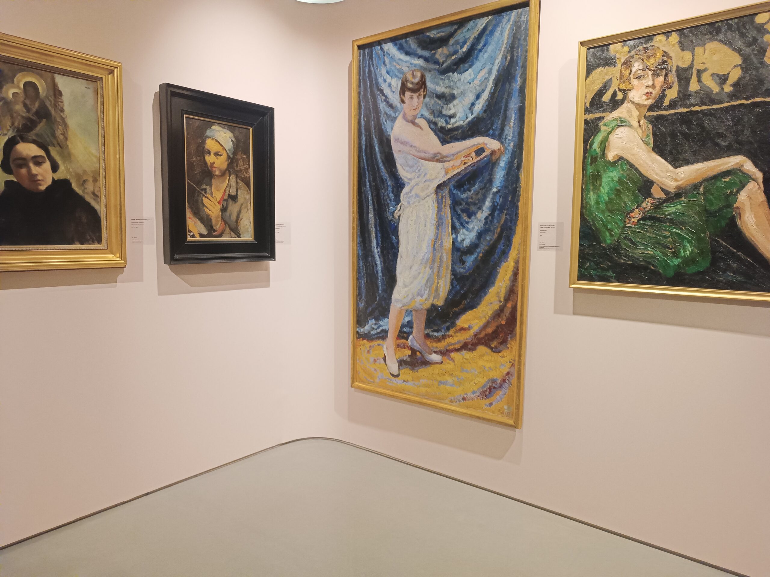Nawet w przypadku pejzaży kobiety napotykały się na ograniczenia, ponieważ samotnego malowania w plenerze zabraniały im konwenanse. Jednak niektóre przełamywały ówczesne zasady. Do nich należała Zofia Stankiewiczówna, pierwsza Polka, która pod opieką matki w 1880 r. wyruszyła do Paryża i wstąpiła do Académie Julian. Na wystawie znajduje się jej, m.in., Zmarzły Staw Gąsiennicowy w Tatrach . Surowe zasady rozluźniła I wojna światowa, choć w drugiej części wystawy mamy kontynuację młodopolskich tradycji przedstawieniowych, to podobnie jak poprzednio artystki odbiegają od schematów, dotykają różnych etapów życia i aspektów kobiecości. Na portretach podejmują kwestie cielesności i seksualności. Ale też podkreślają odrębność społeczną, etniczną, zawodową. Zarazem w drugiej części wystawy wiele nazwisk powtarza się, w tym Aneri, czyli Ireny Weissowej, ukochanej żony i muzy słynnego malarza. Specjalizującej się w pejzażach i martwych naturach z kwiatami o subtelnej jasnej kolorystyce. Ale też poznajemy nowe artystki, a wśród nich Jadwigę Tetmajer – Naimską, czyli Isię z Wesela Wyspiańskiego, utrwalająca na obrazach krajobraz wokół Bronowic. Warto na chwilę zatrzymać się przy Portrecie matki Anny Tetmajerowej, pamiętnej Gospodyni. Natomiast przemiany obyczajowe sygnalizuje, otwierająca tę część wystawy, grafika Wiktorii Goryńskiej Autoportret z telefonem, na której malarka prezentuje siebie w sportowym stroju i z krótko obciętymi włosami.