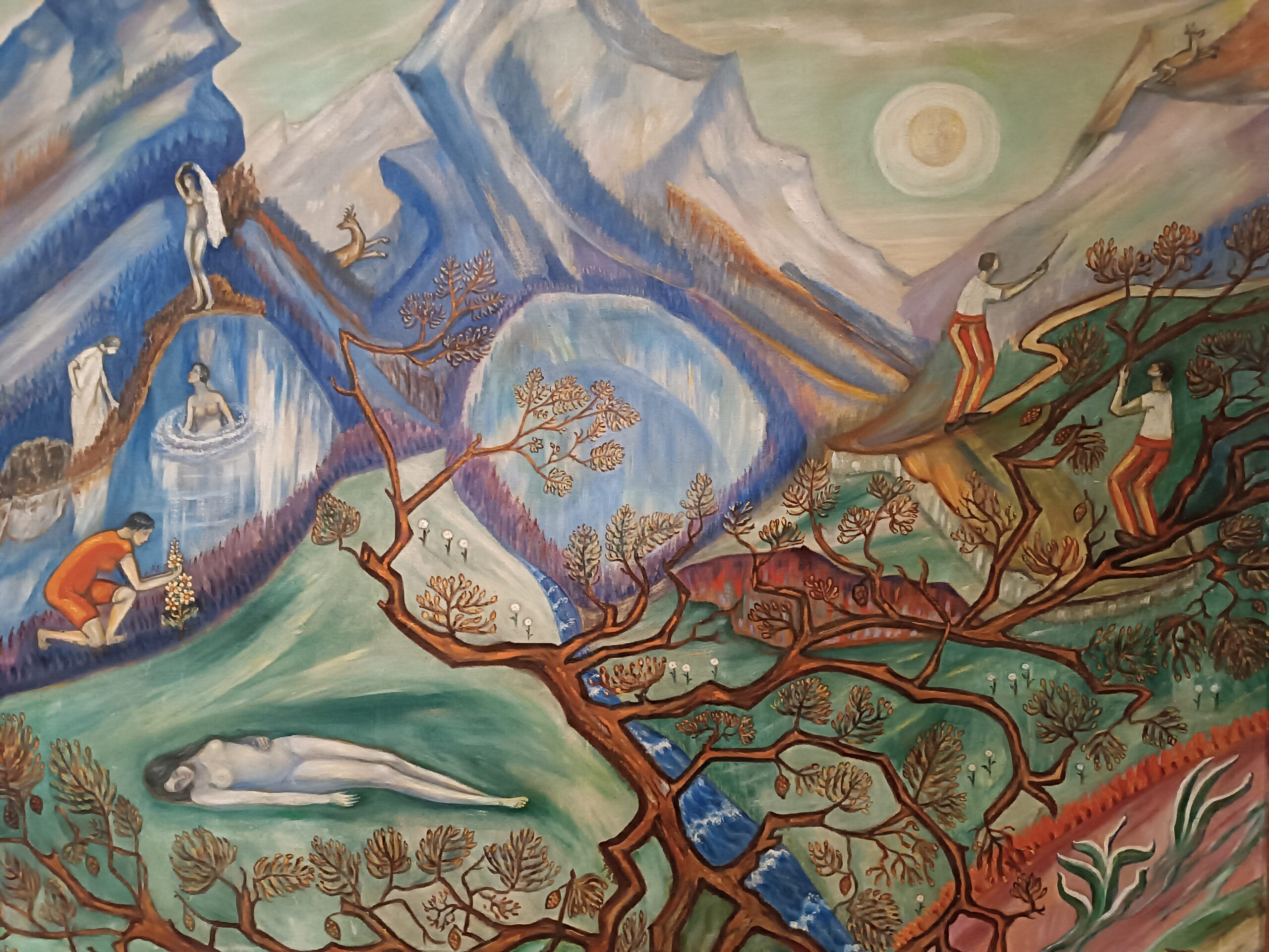 Natomiast finalny obraz, Autoportret. Kobieta z paletą Stefanii Jacyszyn, wybiega poza cezurę czasową, gdyż pochodzi z lat 60. Zarazem stanowi swoistą ramę kompozycyjną i przywołuje na myśl sentencję Ars longa vita brevis. Nie bez powodu emblematem wystawy jest obraz Alegoria sztuki Marii Chmielowskiej, który namalowała na konkurs w szkole Adriana Baranieckiego. Widzimy na nim zwiewną uskrzydloną kobiecą postać z nieodłącznymi atrybutami malarskimi: paletą i pędzlem. Dodam, że jego twórczyni była bratową malarza Adama Chmielowskiego, czyli brata Alberta, i matką Marii Łunkiewicz – Rogoyskiej, nazywanej Niebieskooką Mewą, której kompozycje postkubistyczne znajdują się w drugiej części wystawy. A jej zwiedzanie to zanurzanie w czasie, z jego ograniczeniami i normami pętającymi kobiety. Poznajemy więc efekty pracy i talenty tych, które z determinacją próbowały wywalczyć w nim miejsce dla swojej sztuki.